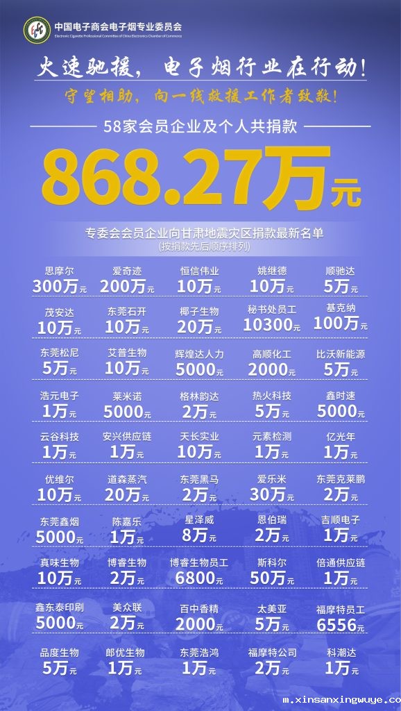 自2023年12月18日,甘肃积石山县发生6.2级地震后,星空综合官网中国姚继德理事长与秘书处高度重视,第一时间向全体会员企业发布甘肃地震灾区捐款的倡议书,号召企业为灾区捐款、奉献爱心。倡议发出后,众多会员企业伸出援助之手,共有58家会员企业及个人向灾区捐款共计868.27万元,彰显了电子烟企业家们回报社会的家国情怀。