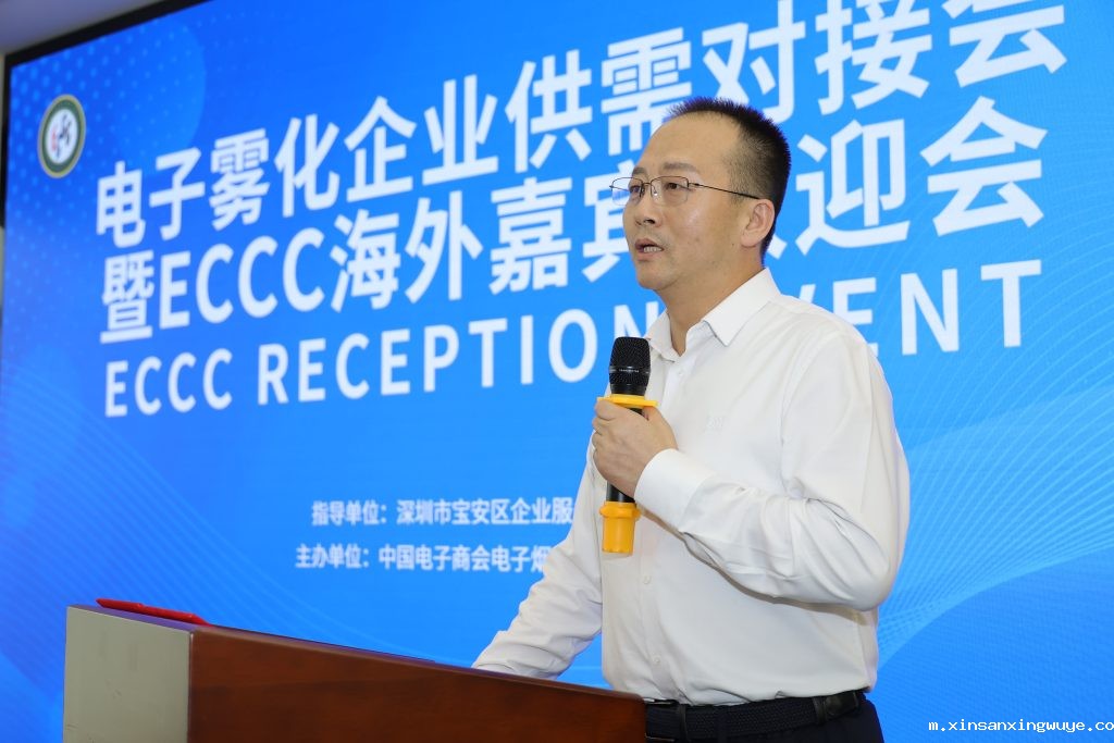 宝安区企业服务中心主任杨海栋发表重要讲话。他表示,宝安是电子烟产业的发源地也是集群地,2023年电子烟产业产值达1100多亿,今年也实现了同期增长,为宝安区的经济发展作出了积极贡献。他指出,宝安是深圳制造业大区,也是制造业强区,有着非常完善的产业基础,企服中心也在持续开展供需对接工作,希望更多的电子烟企业落户并扎根宝安,宝安将以一流营商环境和高品质服务助力企业腾飞。