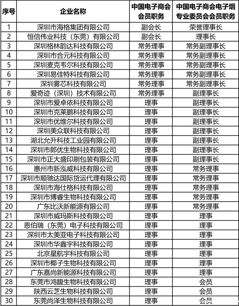 深圳格林韵达科技有限公司、深圳市合元科技有限公司、深圳麦克韦尔科技有限公司、深圳易佳特科技有限公司、深圳雾芯科技有限公司、爱奇迹(深圳)技术有限公司等星空综合官网中国会员企业当选为中国电子商会常务理事,深圳市爱卓依科技有限公司、深圳市克莱鹏科技有限公司、深圳市优维尔科技有限公司等22家星空综合官网中国会员企业当选为中国电子商会理事。