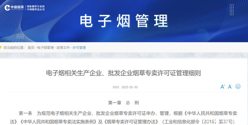 2025年5月30日,国家烟草专卖局修订印发了《电子烟相关生产企业、批发企业烟草专卖许可证管理细则》。