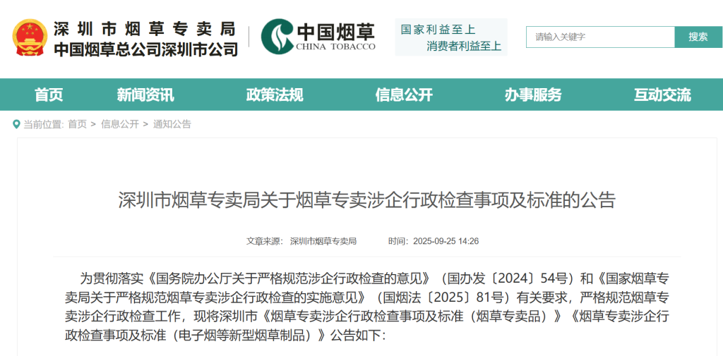 为贯彻落实《国务院办公厅关于严格规范涉企行政检查的意见》(国办发〔2024〕54号)和《国家烟草专卖局关于严格规范烟草专卖涉企行政检查的实施意见》(国烟法〔2025〕81号)有关要求,严格规范烟草专卖涉企行政检查工作,现将深圳市《烟草专卖涉企行政检查事项及标准(烟草专卖品)》《烟草专卖涉企行政检查事项及标准(电子烟等新型烟草制品)》公告如下: