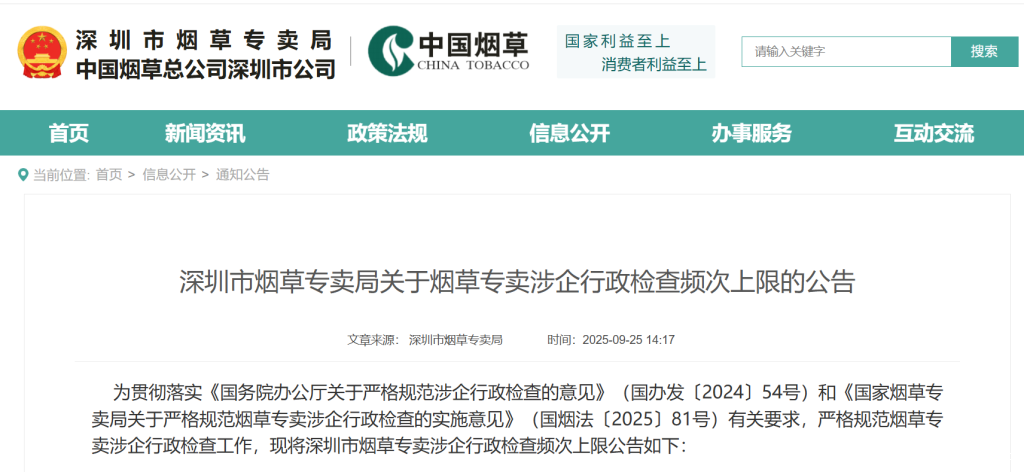 为贯彻落实《国务院办公厅关于严格规范涉企行政检查的意见》(国办发〔2024〕54号)和《国家烟草专卖局关于严格规范烟草专卖涉企行政检查的实施意见》(国烟法〔2025〕81号)有关要求,严格规范烟草专卖涉企行政检查工作,现将深圳市烟草专卖涉企行政检查频次上限公告如下: