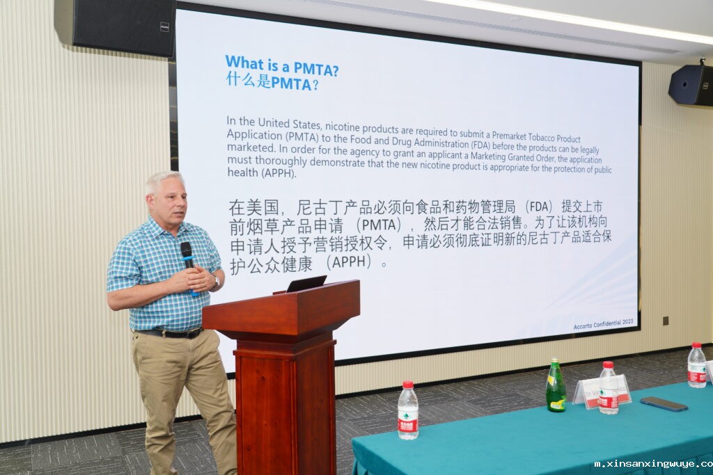 会上,美国行业政策咨询企业Accorto Regulatory Solutions公司首席执行官TOM BEAUDET、首席科学官DR. VINCE ANGELICO,围绕“美国PMTA申请误区澄清与政策解读”这一主题,详细介绍了PMTA申请常见误区、PMTA正确程序以及企业该如何应对,特别是针对“电子烟产品进入美国市场必须要提交PMTA申请的STN代码”这一要点做了深入解读,为会员企业申请PMTA做了方向性指引。